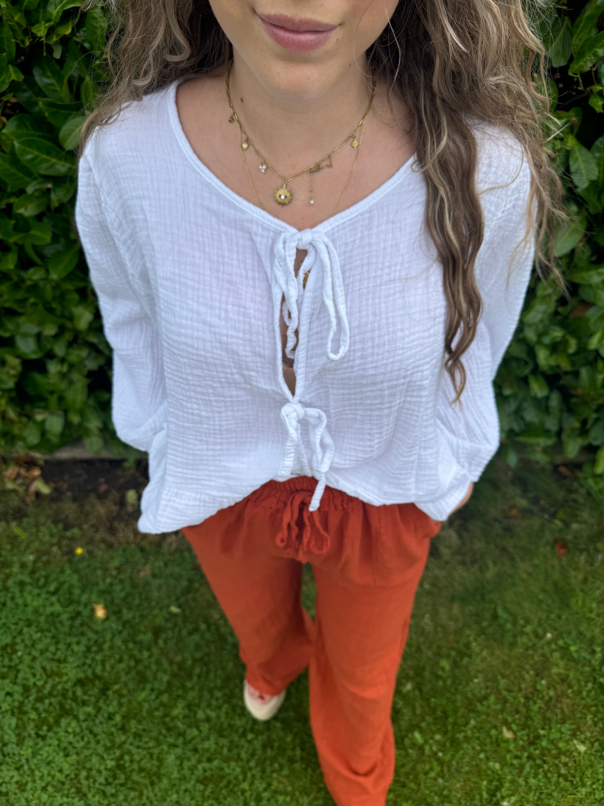 Description : Blouse avec noeud en gaz de coton légère parfaite pour l’été !
