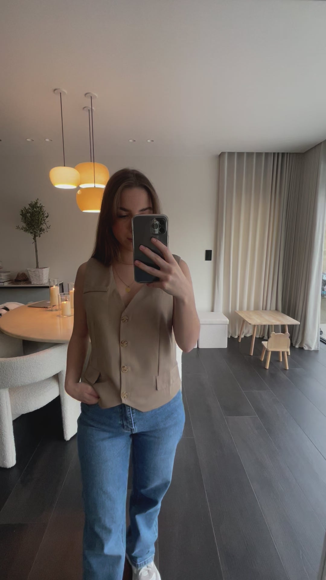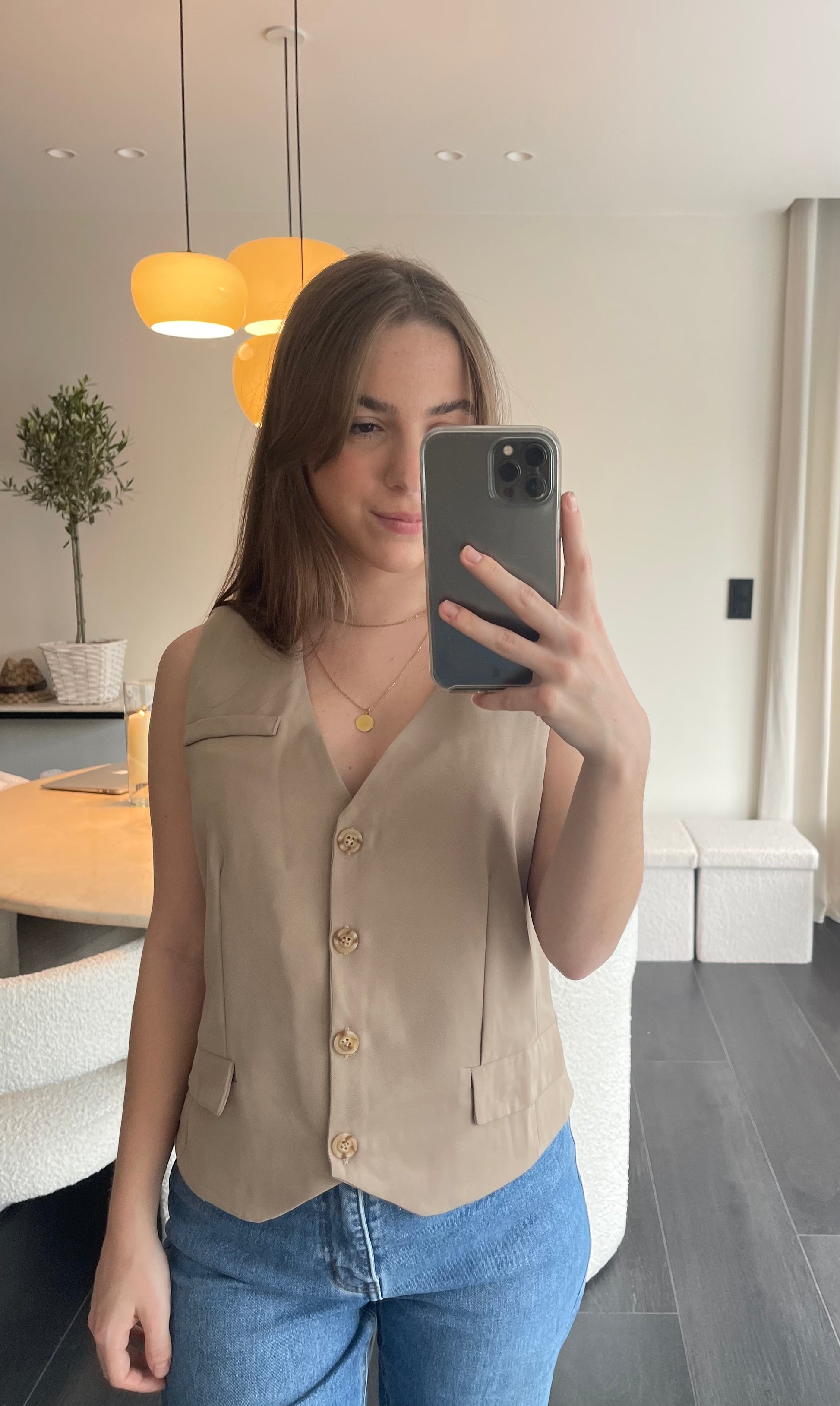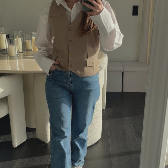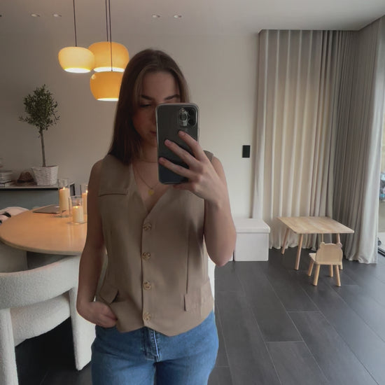 Description : Gilet sans manches beige. Coupe ajustée et sophistiquée. Col en V, fermeture boutonnée sur le devant.