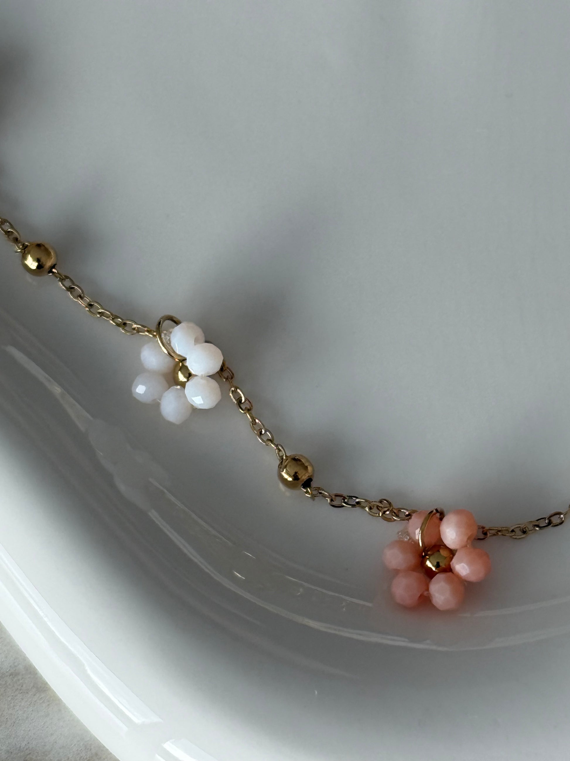 Collier avec 5 fleurs perlées beige en acier inoxydable.