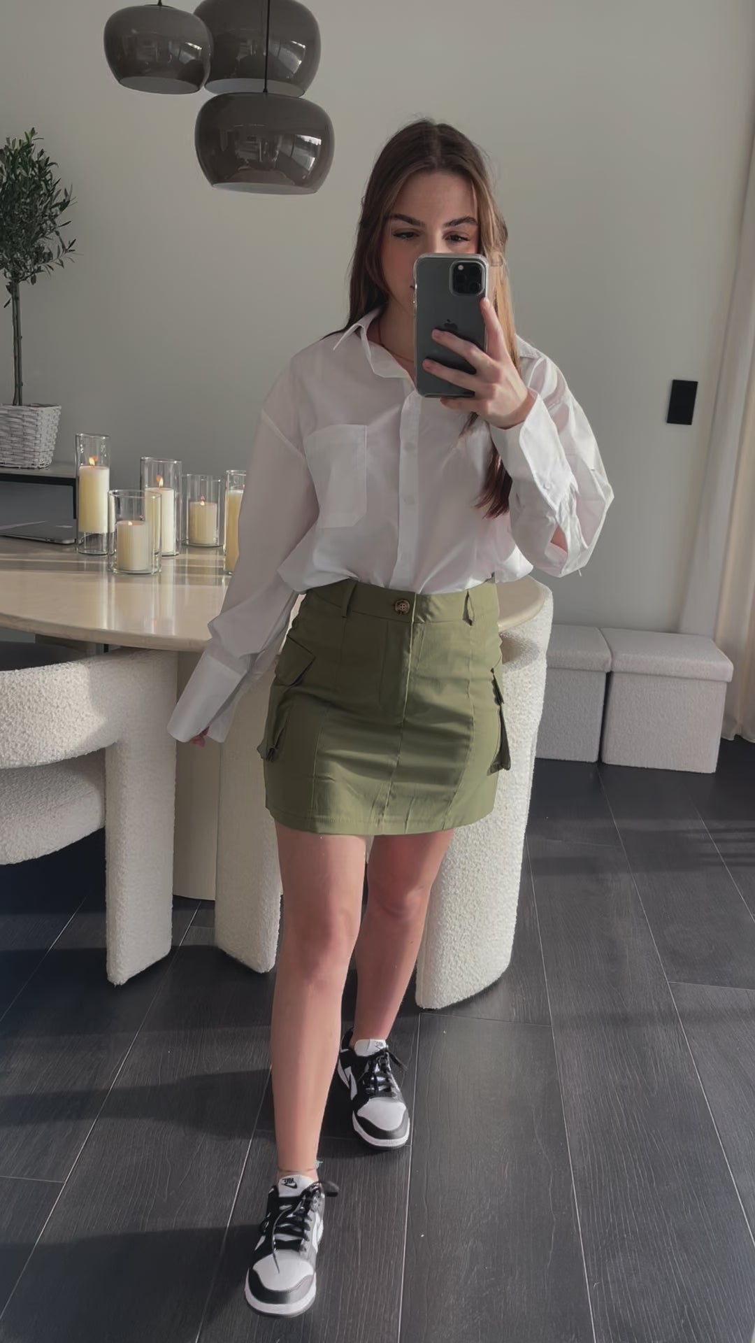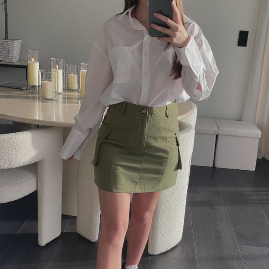 Description : Jupe cargo kaki avec 2 poches à l'avant.