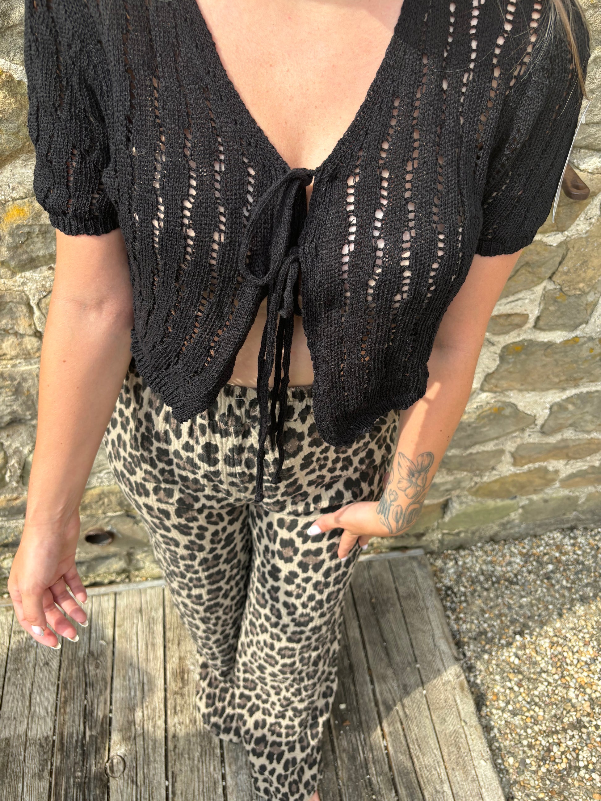 Description :Top court en maille en crochet avec noeuds